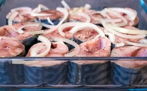 - Приготовление: Сначала подготовьте рыбу — вырежьте внутренности, промойте и нарежьте на порционные кусочки. Затем сварите маринад из воды, сахара, соли и спелых специй на среднем огне. Дайте ему остыть, нарежьте лук и выложите его в емкость для маринования. Как только маринад остынет, залейте им кусочки рыбы, накройте крышкой и оставьте в холодильнике на 12-24 часа.