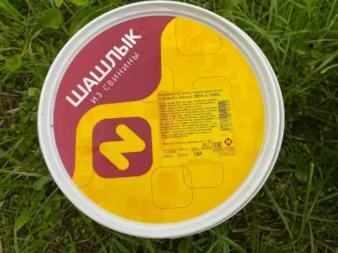 Сразу привлекает внимание объём упаковки и внешний вид кусочков. Это не идеальный нарез в домашних условиях: фрагменты разных форм, часть из них достойна стирки, часть — вызывает вопросы к текстуре и сочности. Маринад кажется стабилизированным и достаточно насыщенным, что внутренне наталкивает на мысль о технологическом подходе к приготовлению.