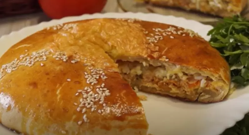 Раскатываем две части теста: одна должна быть чуть больше другой. На меньшую часть помещается слой начинки, сверху посыпается тертым яичным и сыром. Накрываем вторую частью теста, аккуратно зажимая края, чтобы начинка не вытекала. Перед выпечкой пирог смазывается яйцом и посыпается кунжутом, а затем отправляется в разогретую до 180 градусов духовку на 30 минут.
