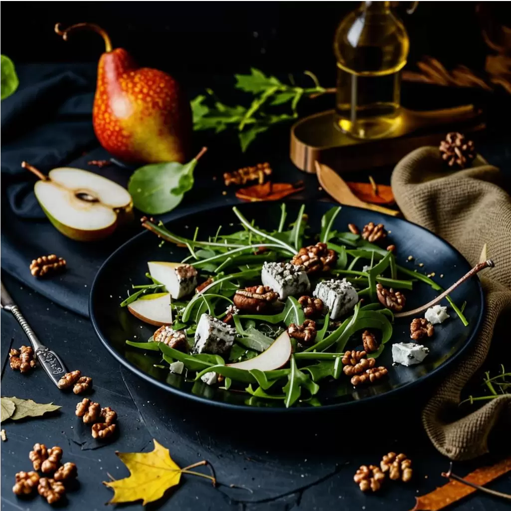 Грушу нарезают тонкими дольками, сбрызгивают лимонным соком, чтобы она не потемнела. Грецкие орехи подрумянивают на сухой сковороде для усиления аромата. Далее готовится соус: в миске смешивают мед, оливковое масло, лимонный сок, немного соли и перца. Все ингредиенты соединяют и заправляют соусом. Этот салат идеально подходит для лёгкого перекуса или как гарнир к основному блюду.