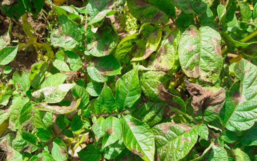 Фитофтороз, вызываемый грибком Phytophthora infestans, — это один из самых опасных врагов картофеля. В отличие от солнечных ожогов, характерные черные пятна на листьях говорят о присутствии этой болезни. Развиваясь в благоприятных условиях, грибок может поразить не только листья, но и стебли, а также клубни. Его споры легко разносятся ветром и процесс заражения может быть стремительным, особенно в условиях высокой влажности и температуры от +15 до +20°C.