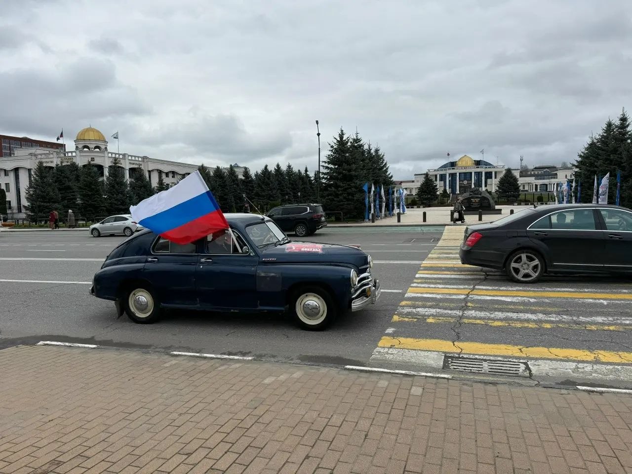 Колонна ехала под государственными и национальными флагами. Особое внимание привлекли ретро-автомобили — легендарные «Победа» и «Волга».