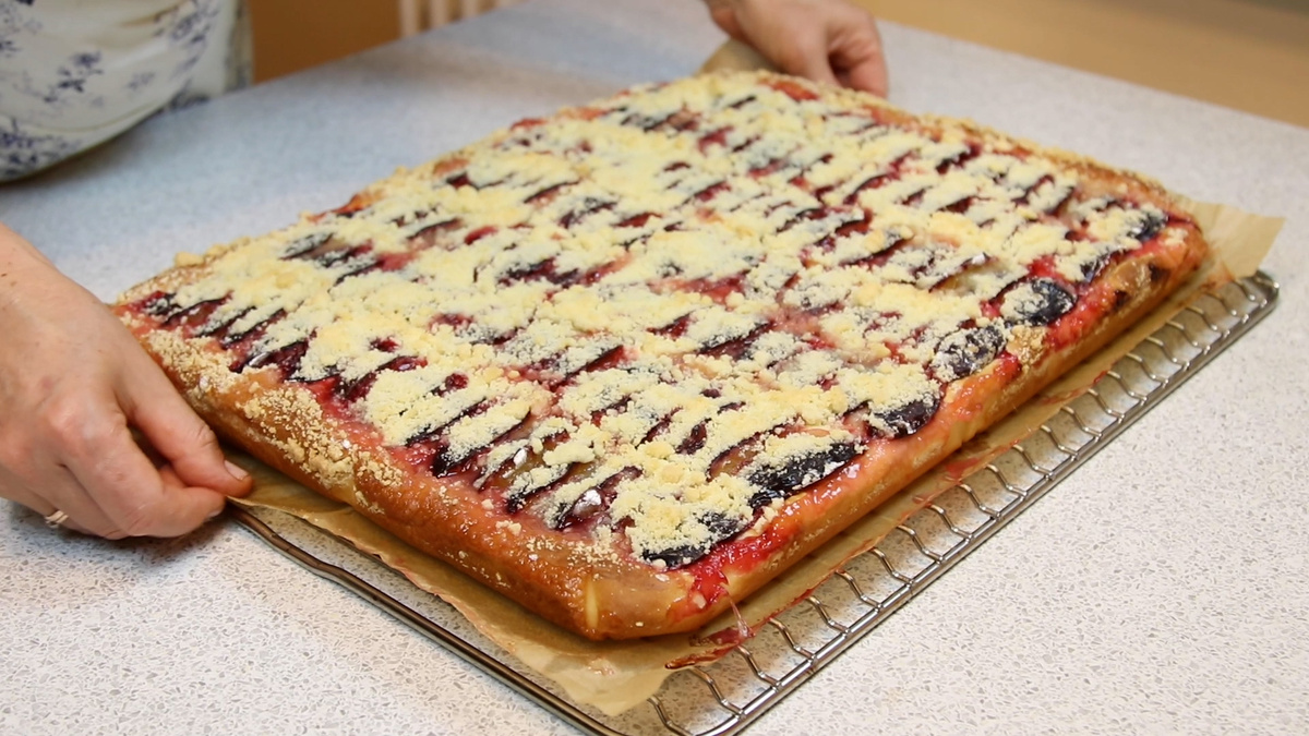 Тесто раскатывается и помещается в противень с пергаментом. Его оставляют подниматься примерно на 1,5 часа, чтобы оно удвоилось в объёме. В это время готовят крошку для посыпки, для чего необходимо соединить муку с сахаром, добавить холодное нарезанное сливочное масло и тщательно перетереть до состояния крошки.